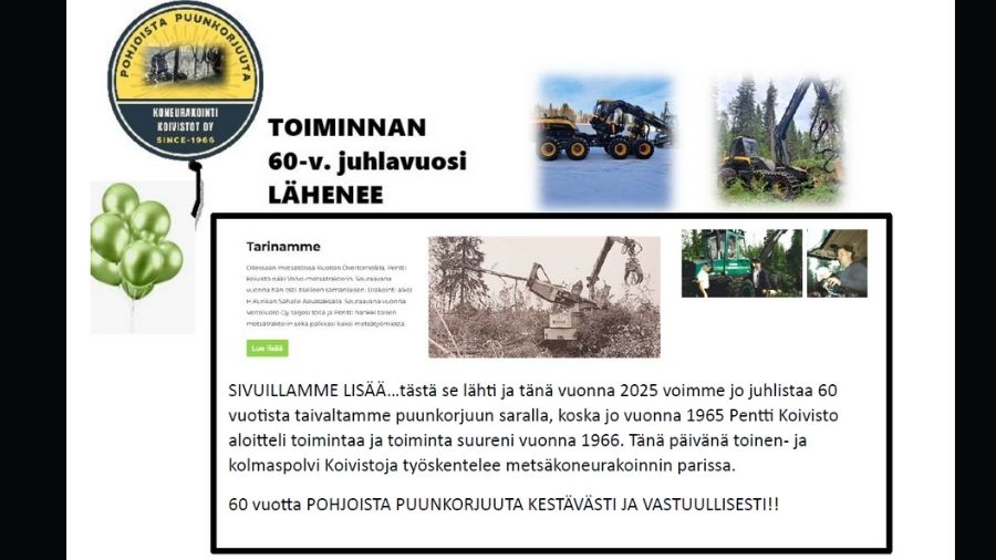 60-vuotta alkaa olla metsäkoneurakointia Meri-Lapin alueella takana. On aika KIITTÄÄ työntekijöitä, entisiä ja nykyisiä sekä yhteistyökumppaneita, urakoitsijoita, metsänomistajia kuluneista vuosikymmenistä!