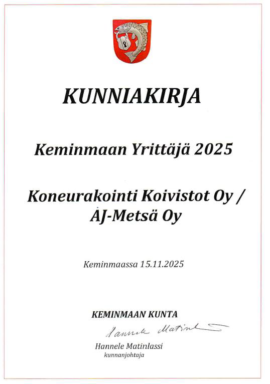 Kiitos kaikille! Erityisesti meidän työntekijöille, urakanantajille, yhteistyökumppaneille, urakoitsijoille ja metsänomistajille sekä